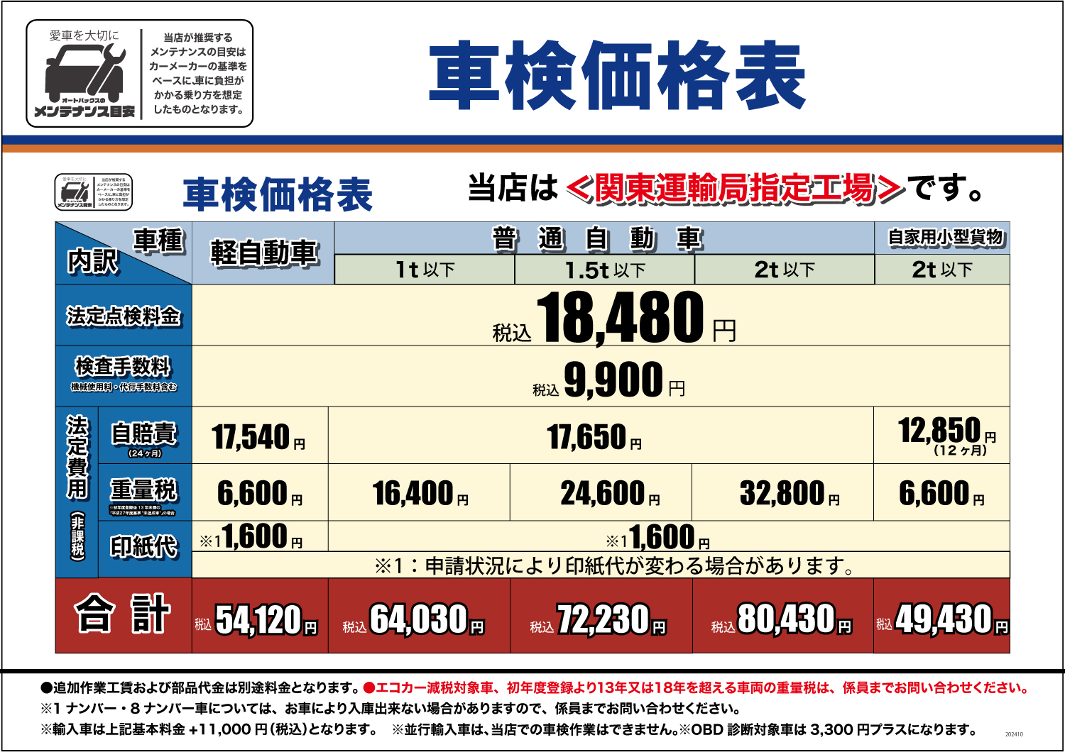 - 輸入車は車検基本点検整備料に、10,000円(税込11,000円)プラスとなります。